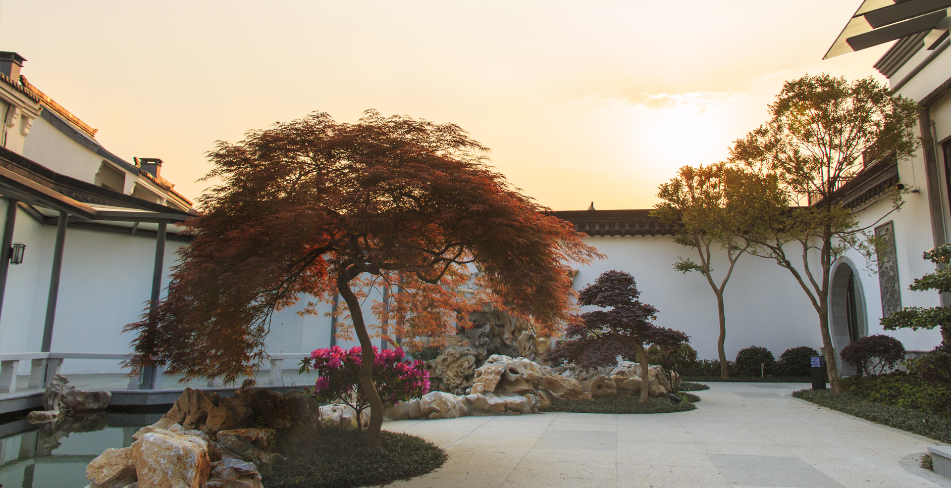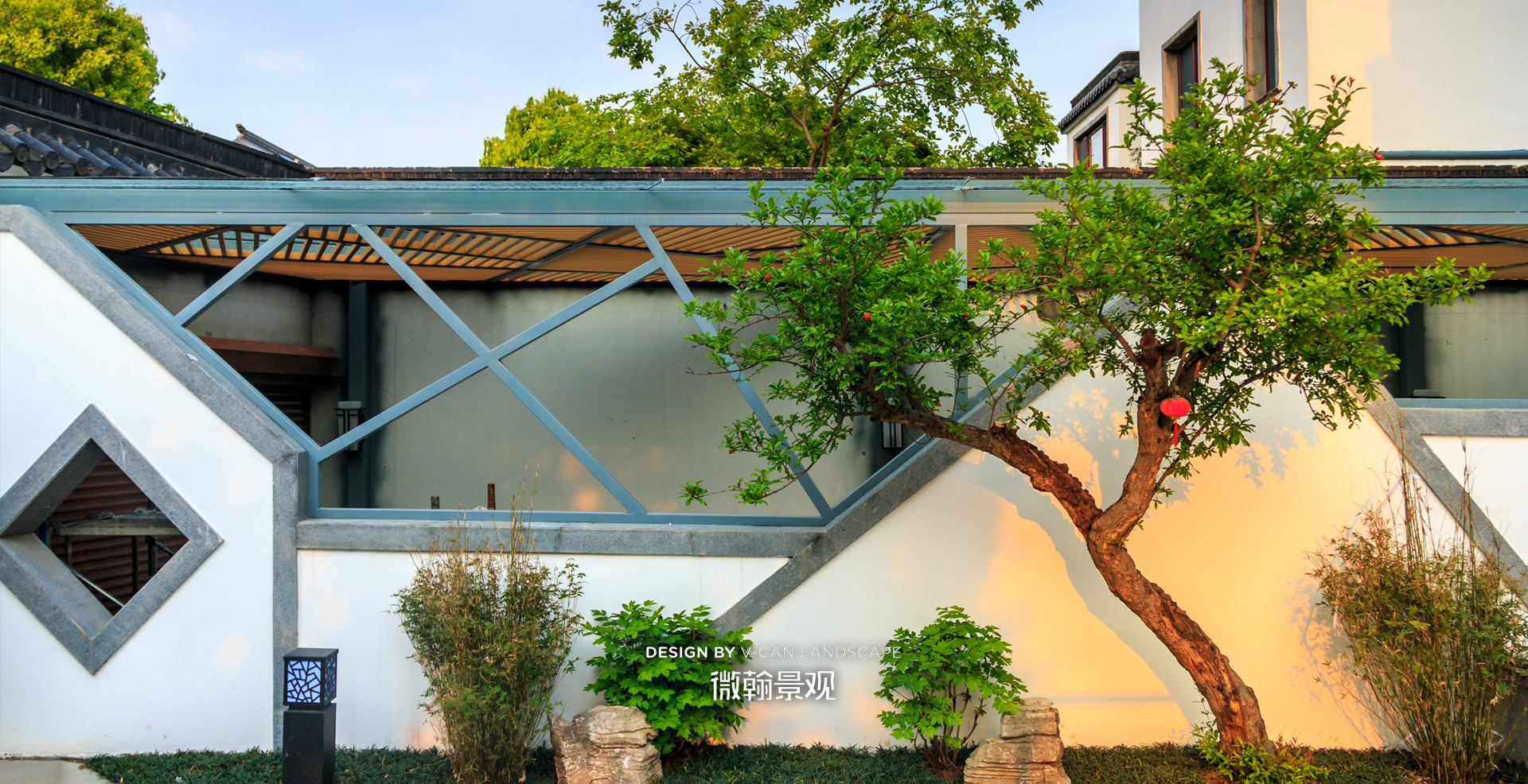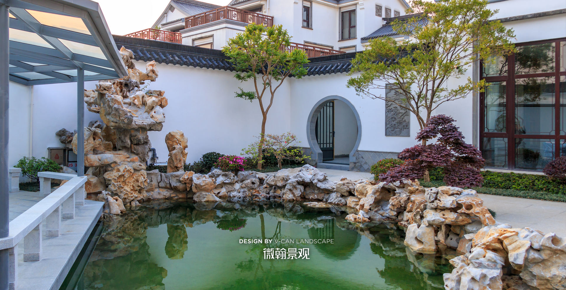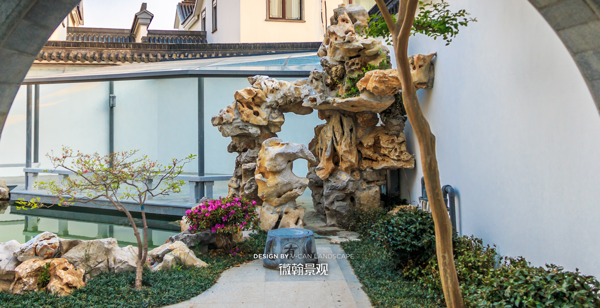 假山、小桥、流水养花喂鱼,是我们中国庭院应有的标签。本案迎合建筑、院墙的特质,将传统木结构廊亭替换为钢结构玻璃廊亭,采用一些新材料,展现出中式庭院新的质感和气质。